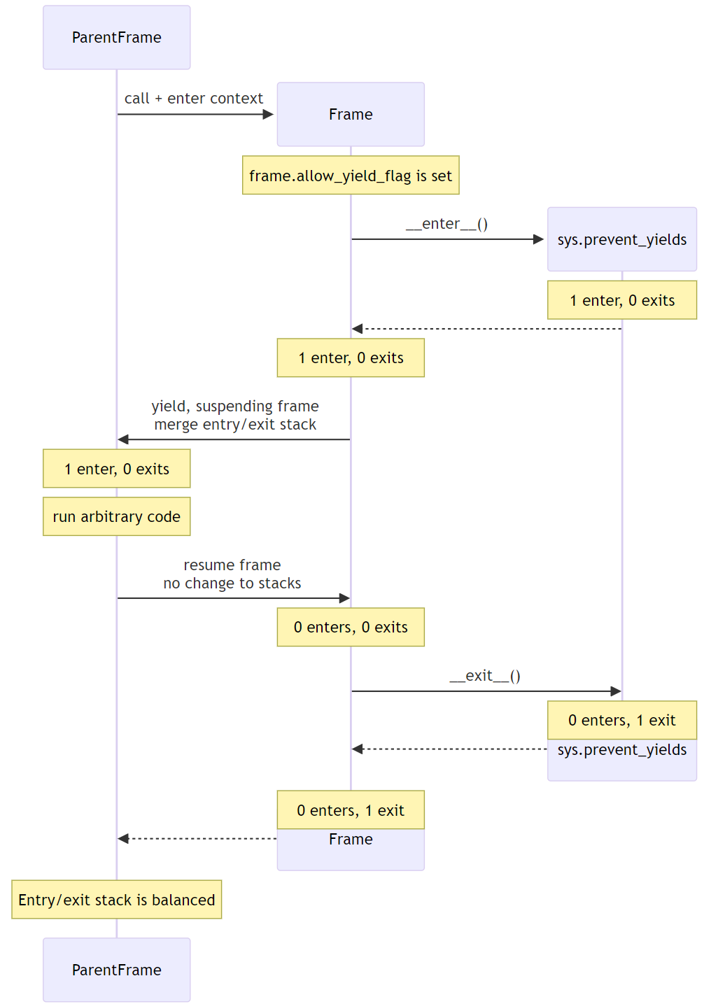In this example, we see multiple rounds of the stack merging as we unwind from sys.prevent_yields, through the user-defined ContextManager, back to the original Frame. For brevity, the reason for preventing yields is not shown; it is part of the “1 enter” state.