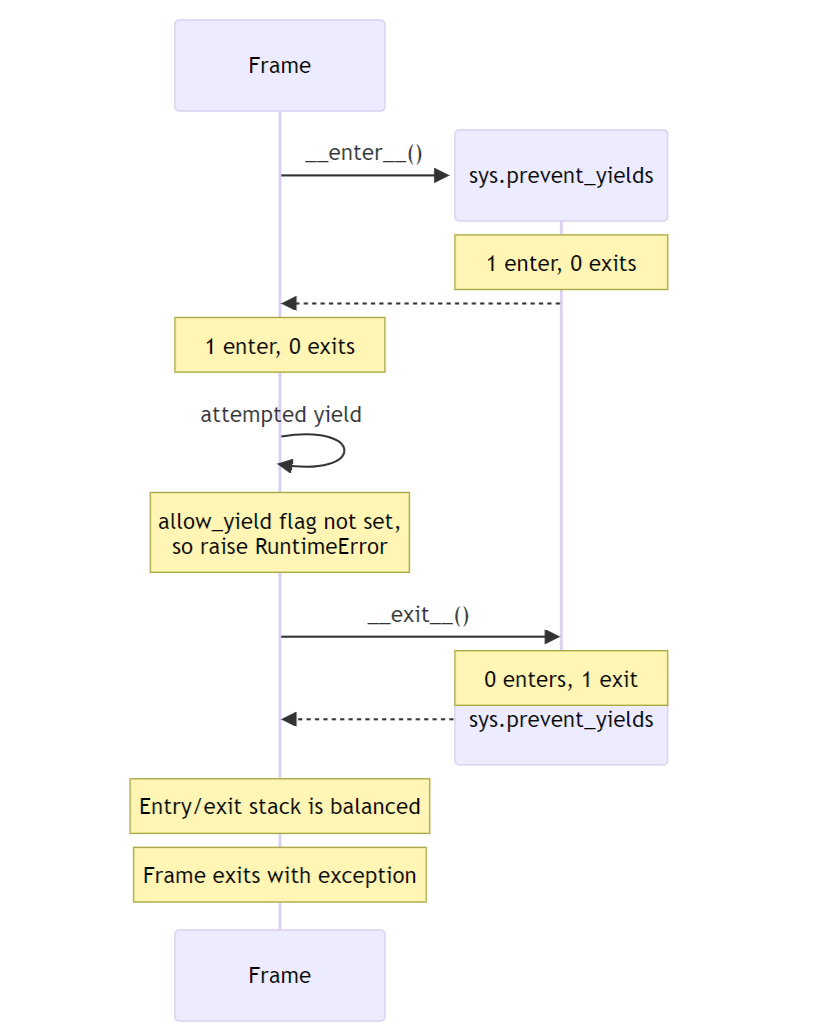 In this example, the Frame attempts to yield while inside the sys.prevent_yields context. This is detected by the interpreter, which raises a RuntimeError instead of suspending the frame.
